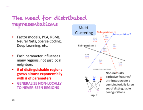 ディープラーニングに関して何より驚かされるのは、そのシンプルさです。10年前は、機械認識の問題において、勾配降下法で訓練したシンプルなパラメトリックモデルを使い、これほど見事な結果に到達するなど誰も想像しませんでした。今では、 十分に多い 事例に対する勾配降下法で訓練した、 十分に大きな パラメディックモデルさえあればよいのです。かつてFeynmanが宇宙を指して言ったように、 「複雑ではない、ただ量が多いだけ」 なのです。